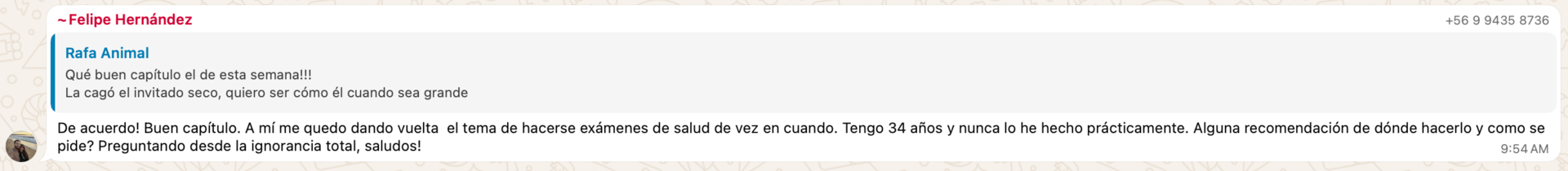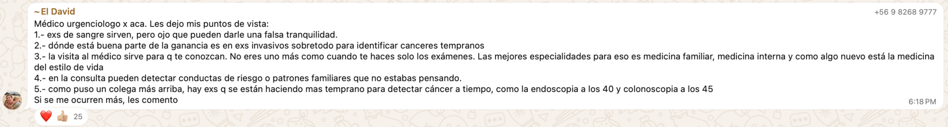 Las respuestas a esa pregunta no pararon de llegar. Desde convenios con clínicas e isapres, servicios como Examedi y la importancia de tener un médico que acompañe en el camino. Dejo el comentario con más likes.
